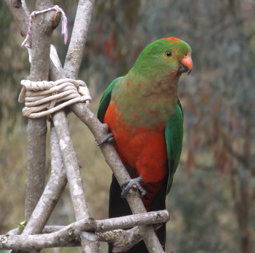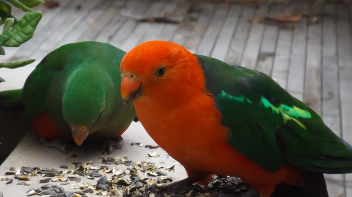 The King Parrots are gentler, shyer birds who will eat food from your hand. They visit each day and call out as soon as they arrive.