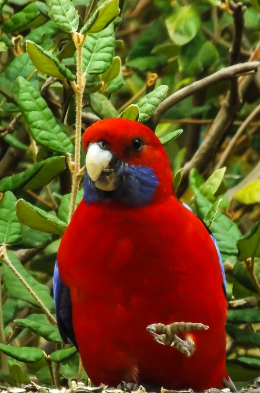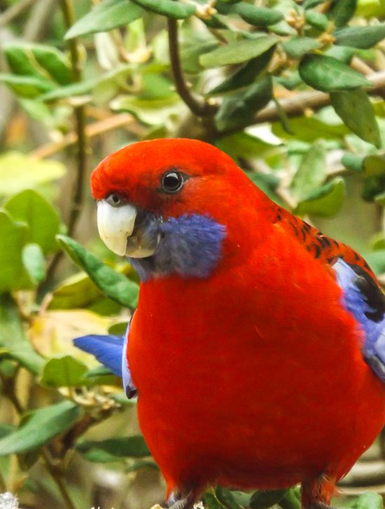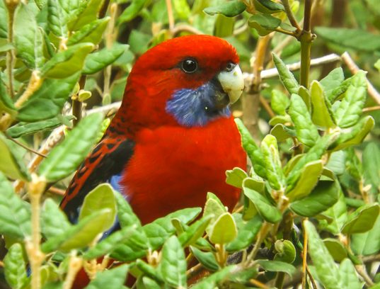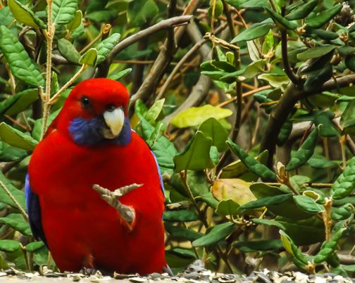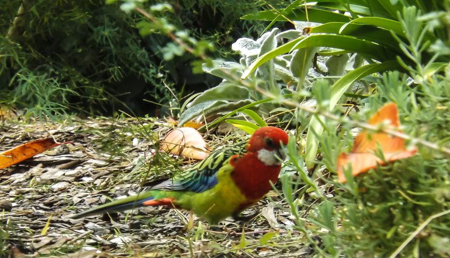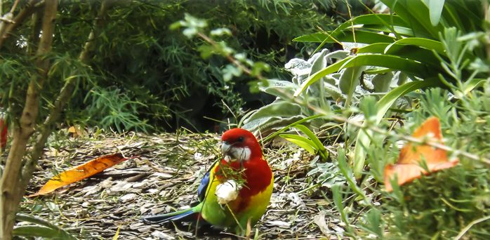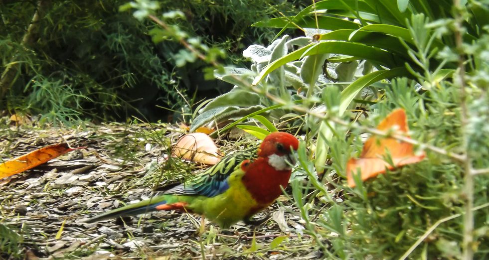 The Eastern Rosella is especially vividly coloured — red and yellow and blue and green and black patterns. When rosellas are feeding on the ground among the grass or perched in the trees they can be very difficult to see – despite their bright colours they blend well!