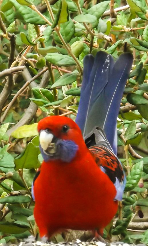 Lets not be mistaken though the Lorikeets still own the space – a Crimson Rosella started eating the left overs from the King Parrot and he stayed for ages. There are two of them nesting high up in one of the gum trees but they rarely venture down – preferring the berries and correos tree.