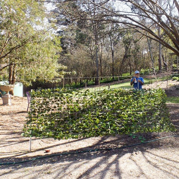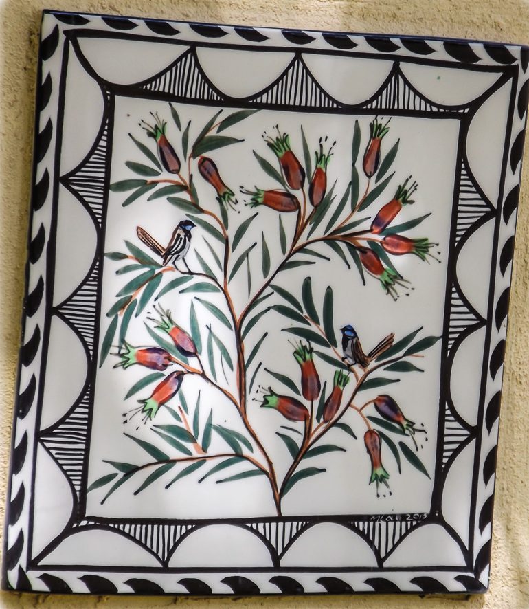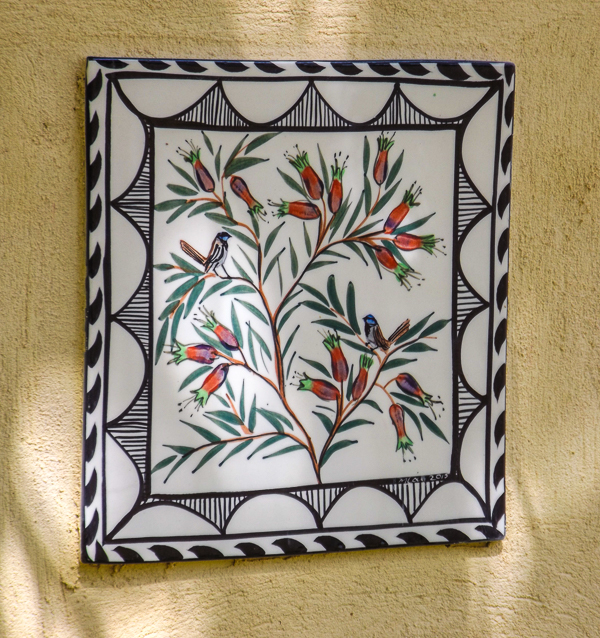 We had the idea of a tiled panel like you see in Tuscany and Greece with a tap coming out and running water – Mary-lou had great ideas and off she went – then COVID came, then we waited for the right weather and Vince glued them up at last.
