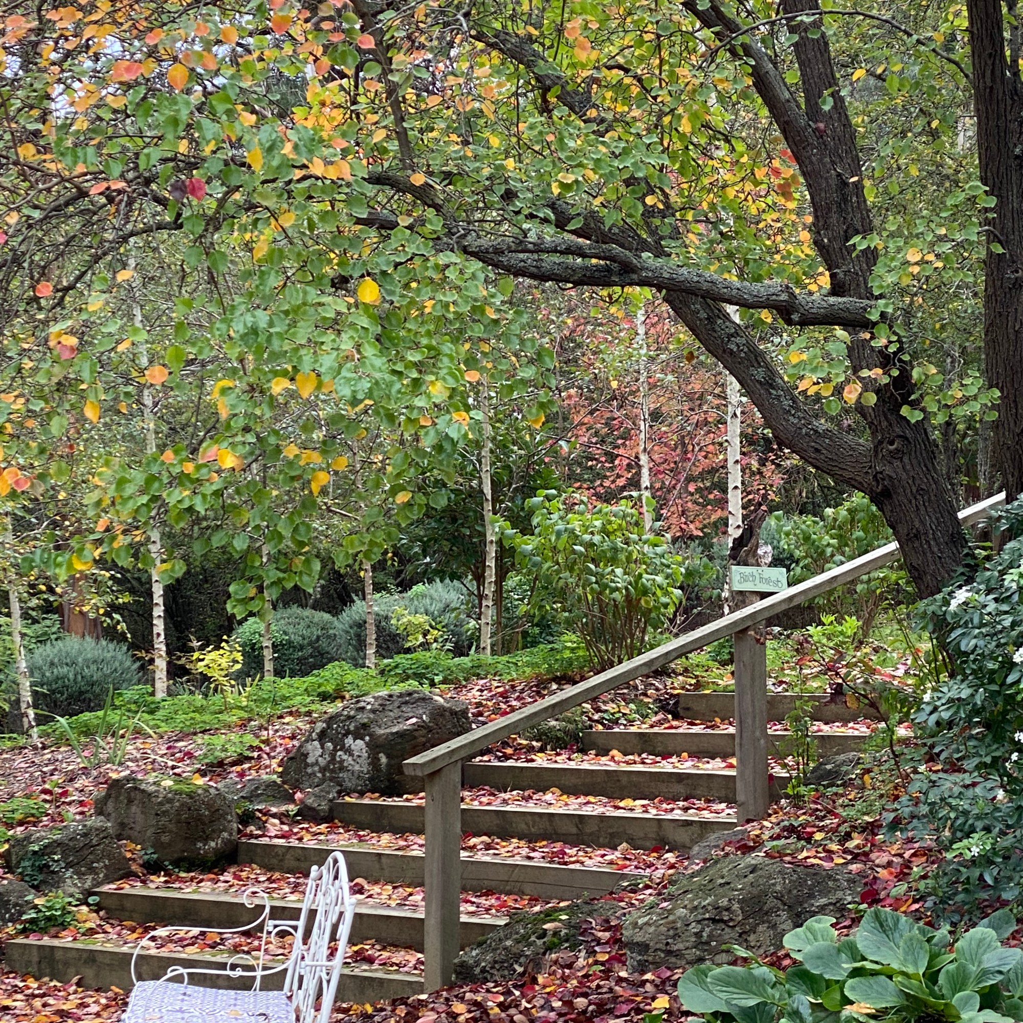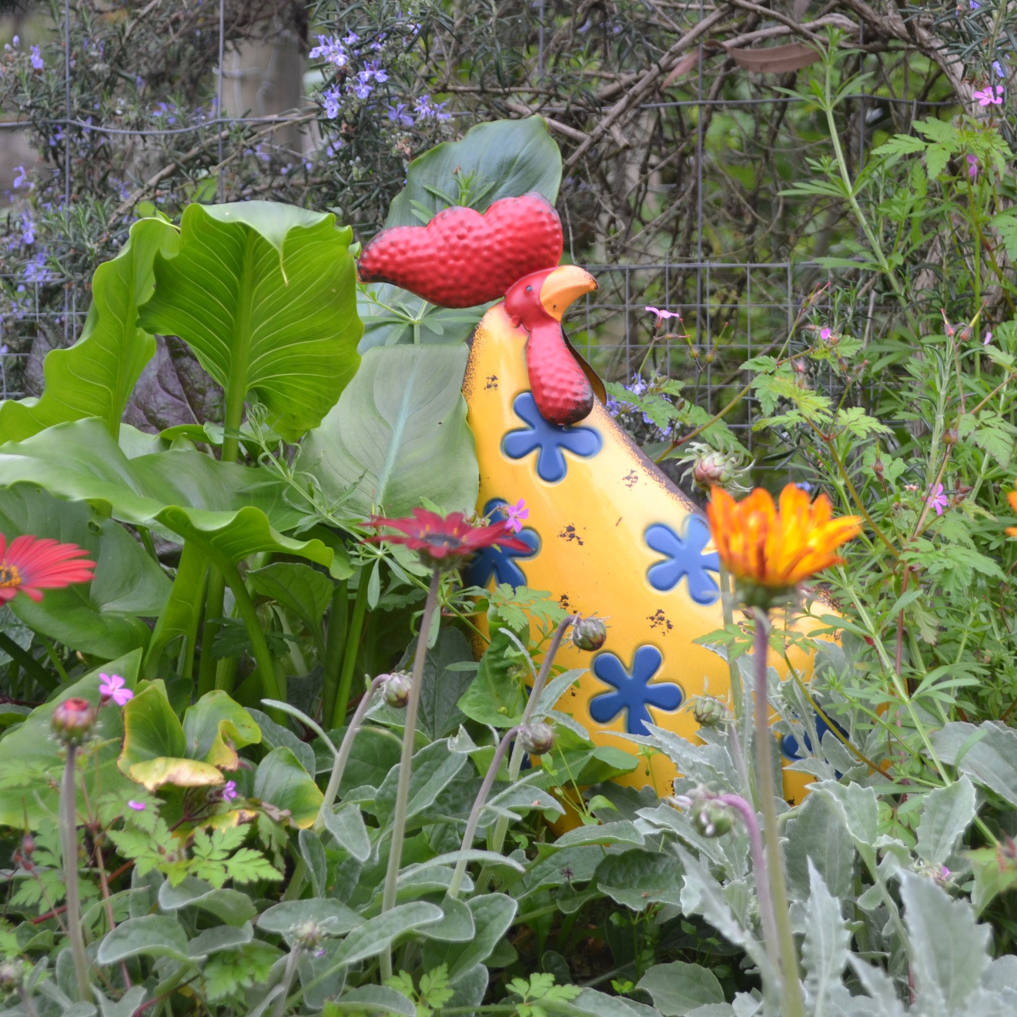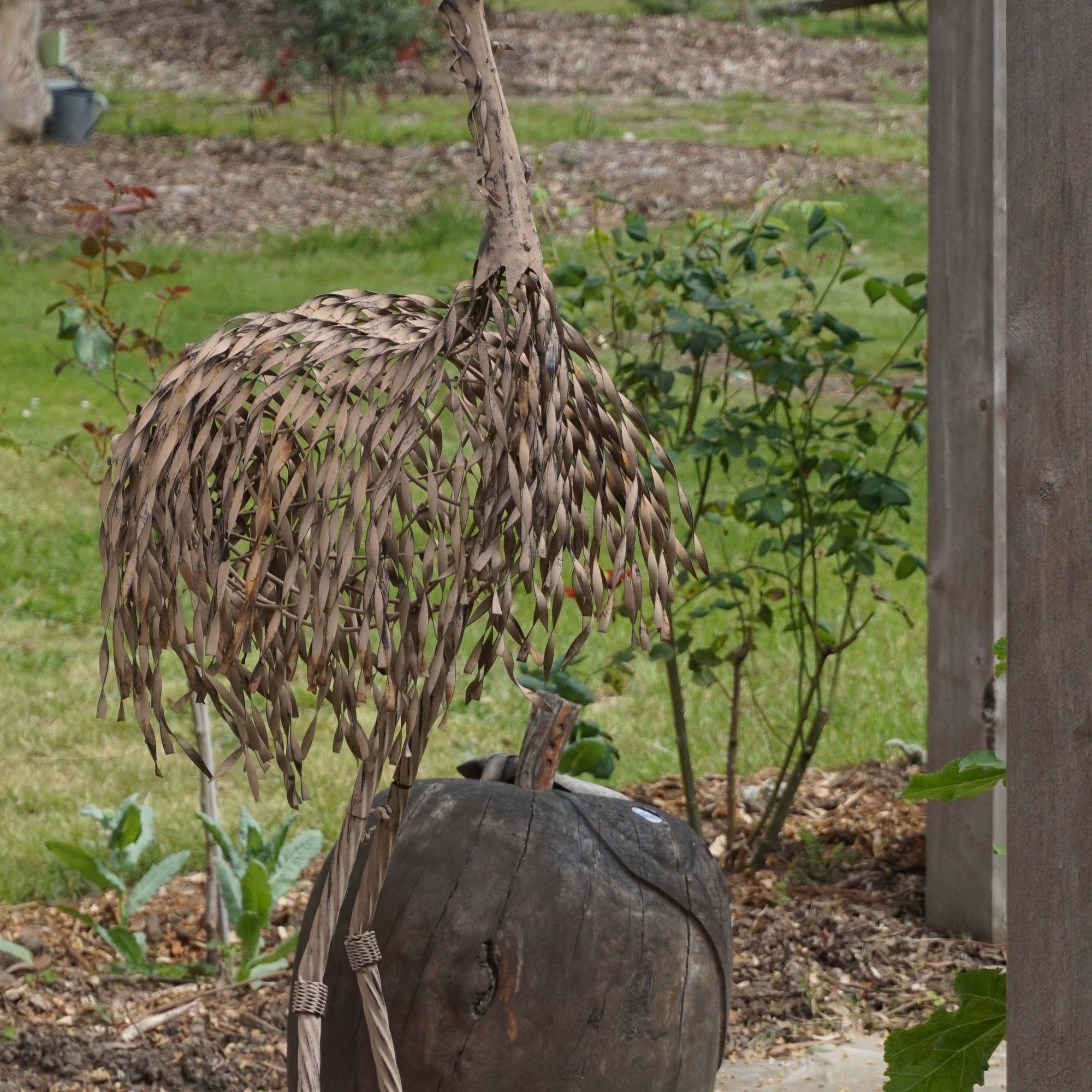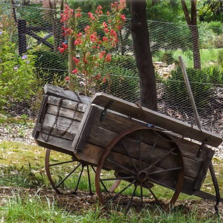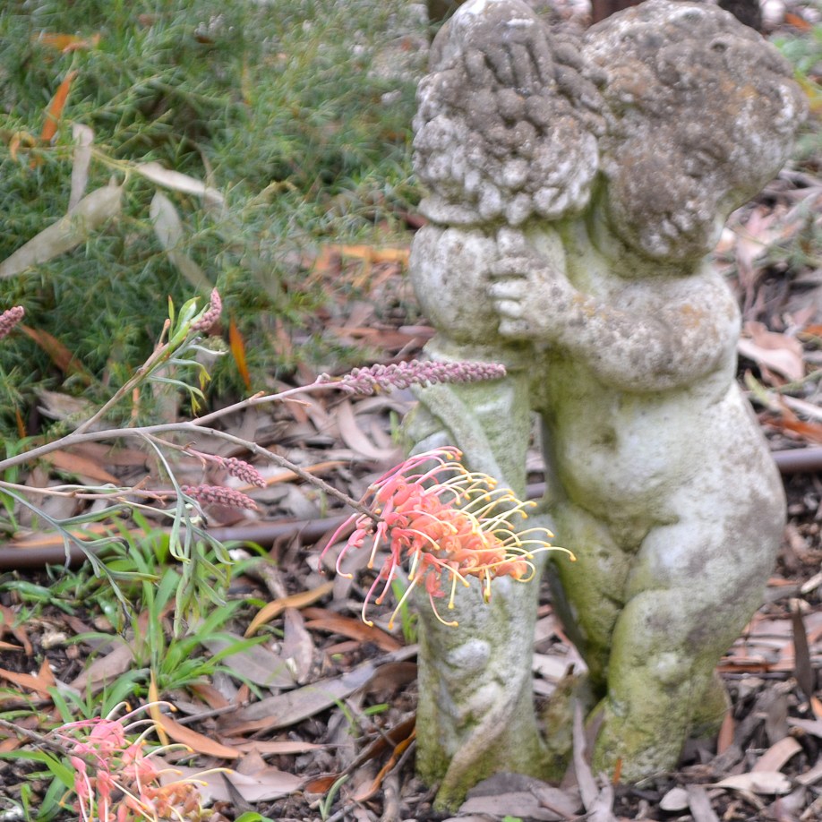In the garden there are bird houses, baths, a giant apple, emu, concrete koala and angel – and mushrooms like Edna used to make… Seating is always close by – and helps to make sure everyone is well rested while walking around. Even the old cart holds branches and logs!