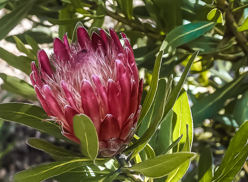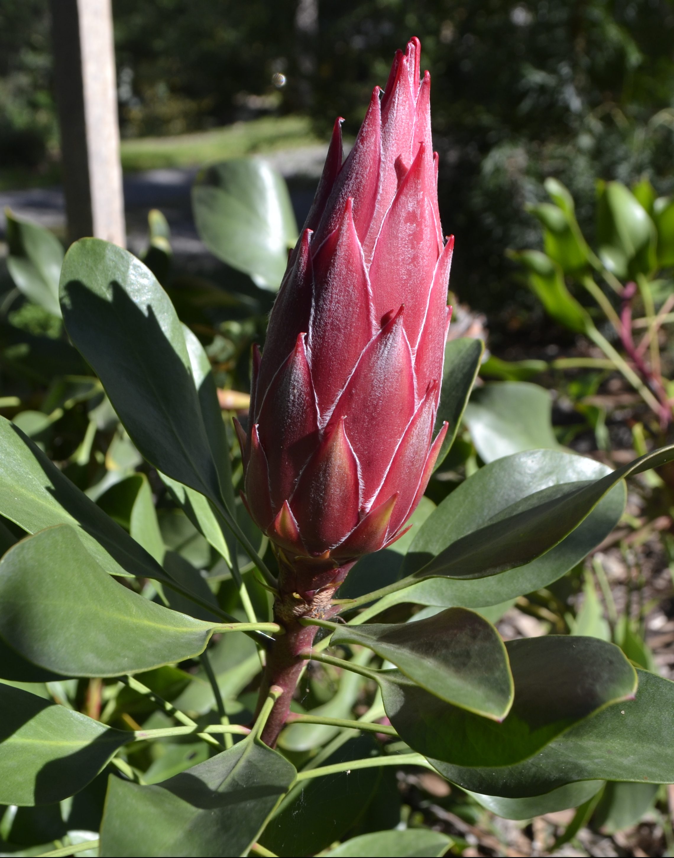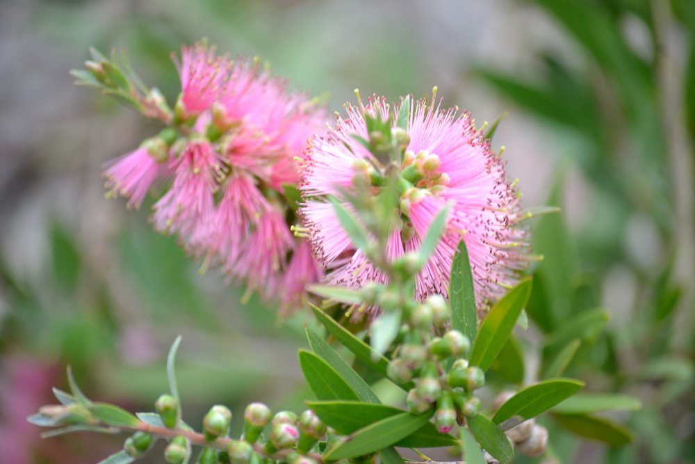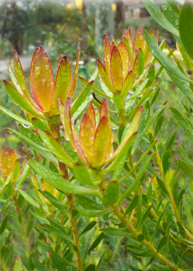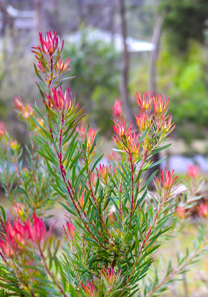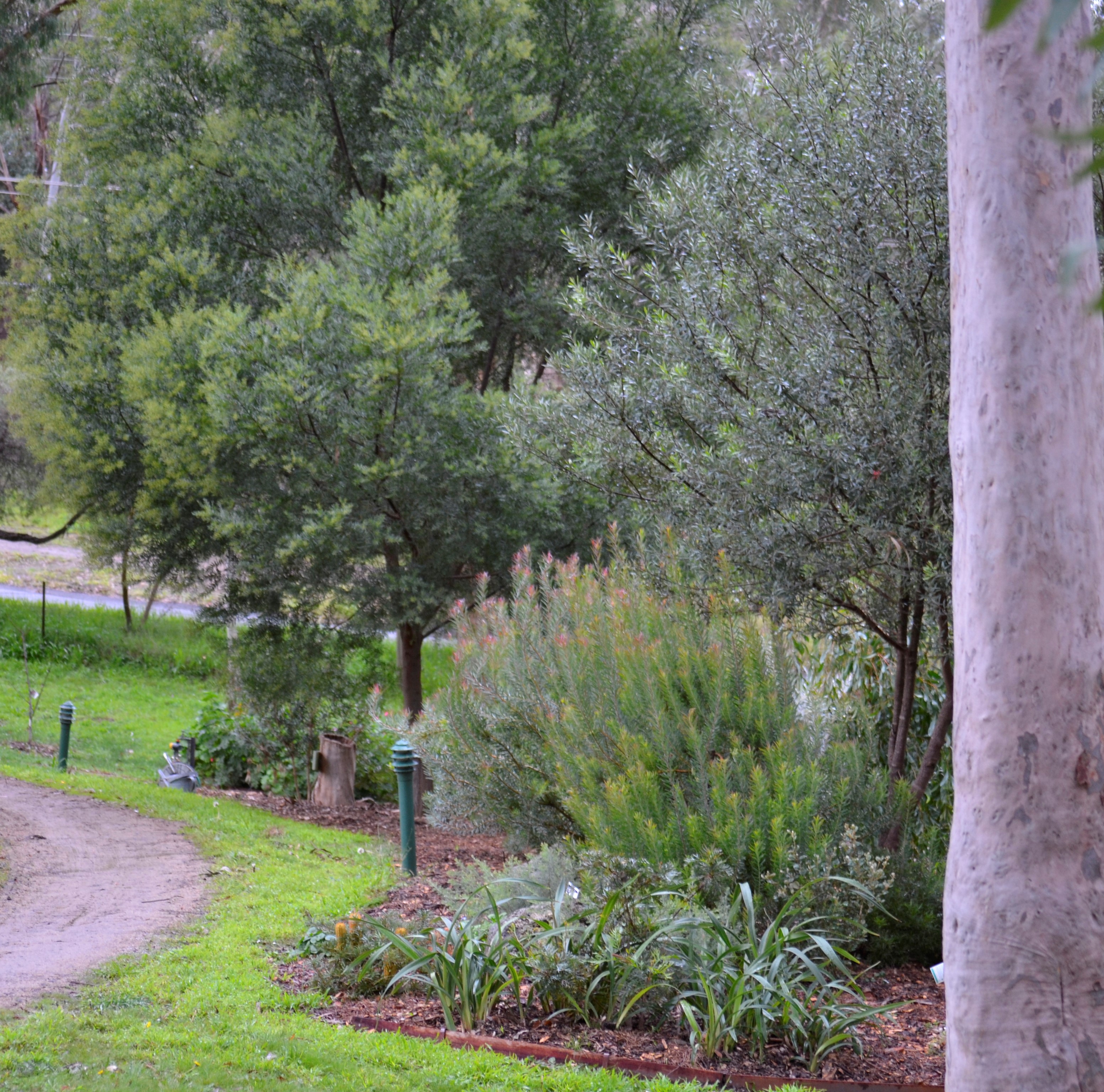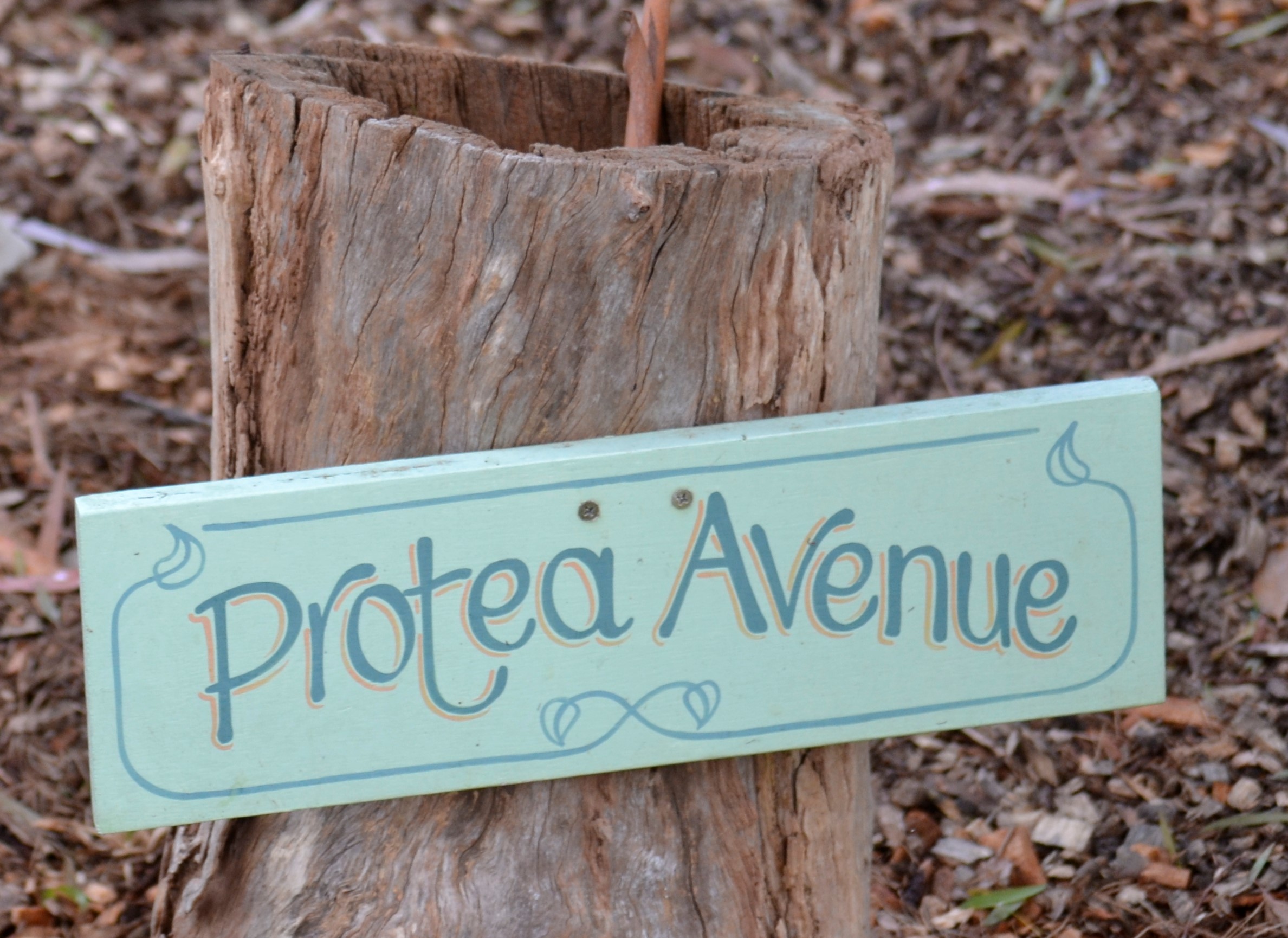 The “Welcome Beds” – as you drive up the Lane you will pass through two garden beds which includes Protea Avenue. There are mainly natives with protea, leucadendrons, banksias, waratah and Stuart desert pea ground cover going over the rocks. There are bird baths & houses – and some wooden mushrooms.