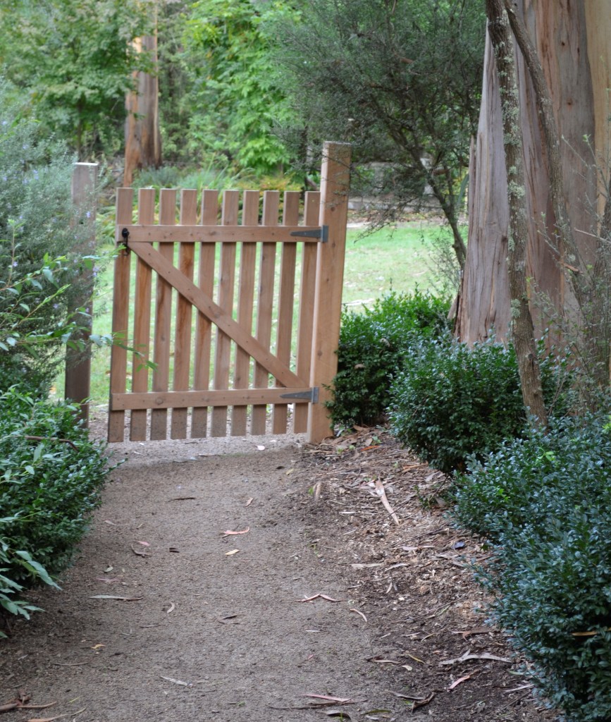 We added another Secret Garden. We put a gate at the top of the bank which leads to a path that gives you a view of the whole back garden – and best thing is you are totally hidden. It is called “the Native Patch” as we continue to focus on Australian Natives which can withstand the heat and lack of water better than the exotics. You just walk past the white seat and follow the stairs. Then you are at the viewing seat to look at the [chooks!.]