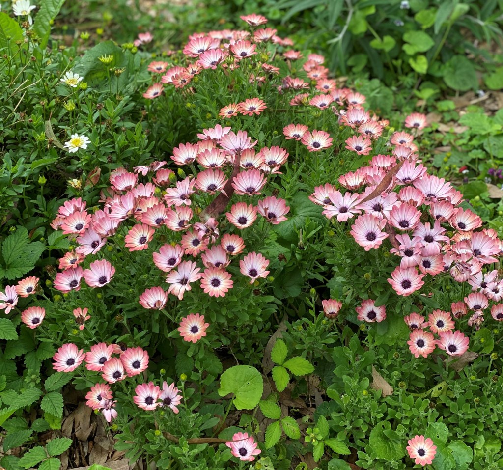 So the Perennial Meadow/Garden is now established and despite being planted exactly differently to all good advice – eg. Tall at the back – ground cover at front it is just perfect for Uccello lane. It is on a slope so anyway you view it is fine plus we have put a temporary stepping stone pathway in so you can meander through and see everything! We got wastepaper baskets from KMart to cover small plant from the rabbits which worked really well. – until it didn’t. The rabbits just ate everything and the “meadow” look was out of control.