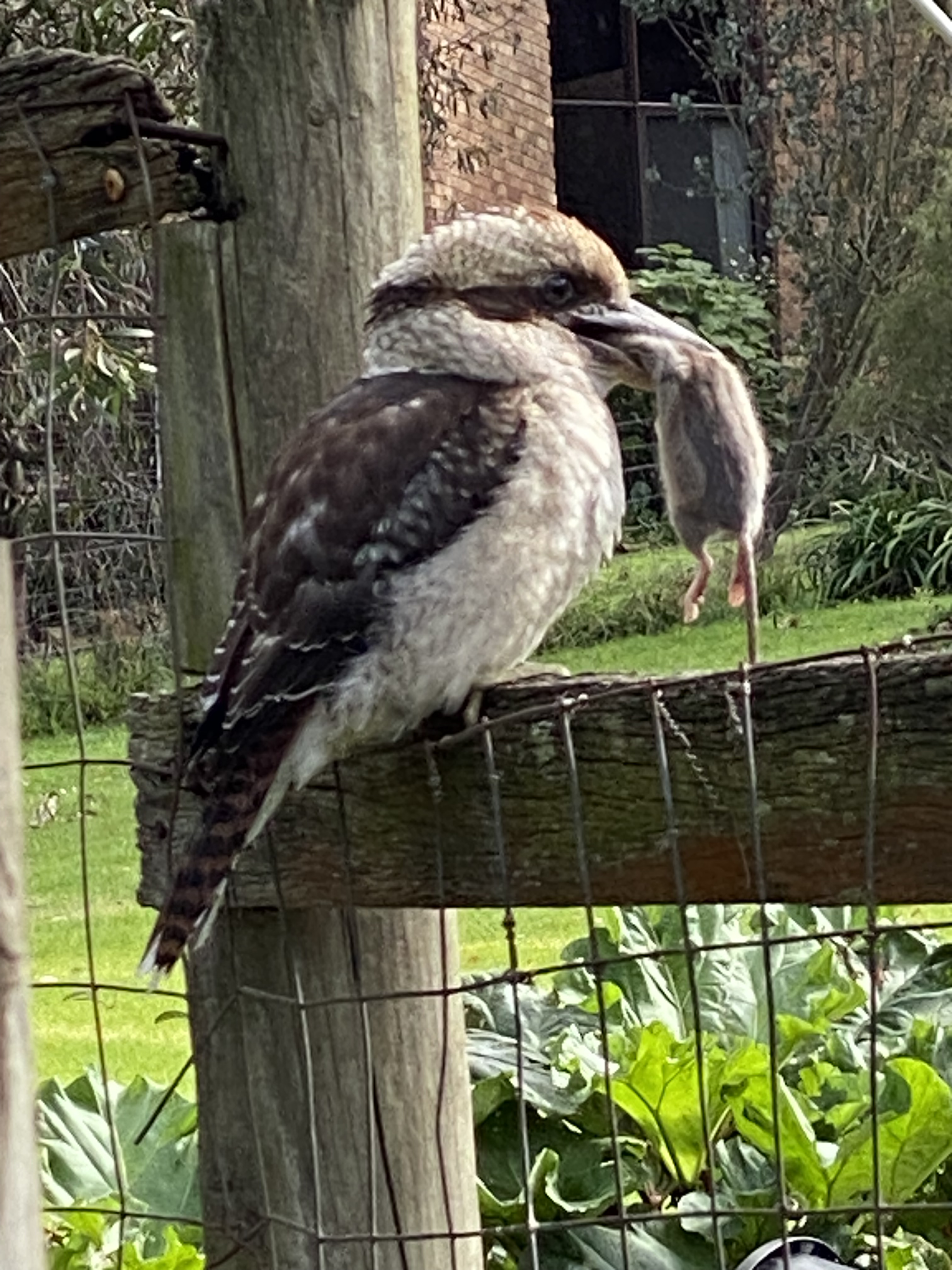 The kookaburras at Uccello Lane have formed a colony with several nests in hollow logs. They are after all hunters and see the video below for evidence.