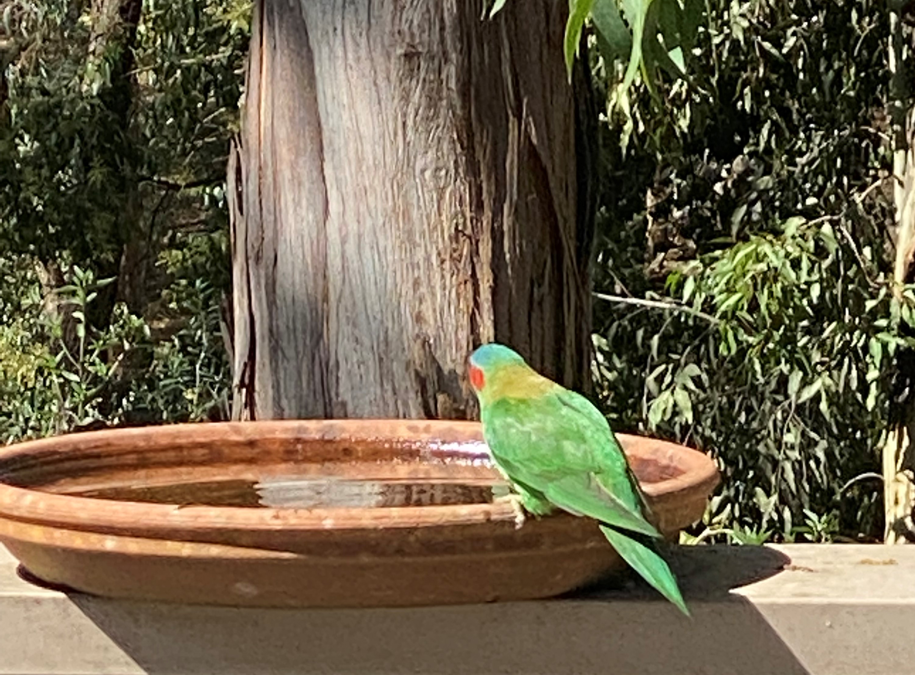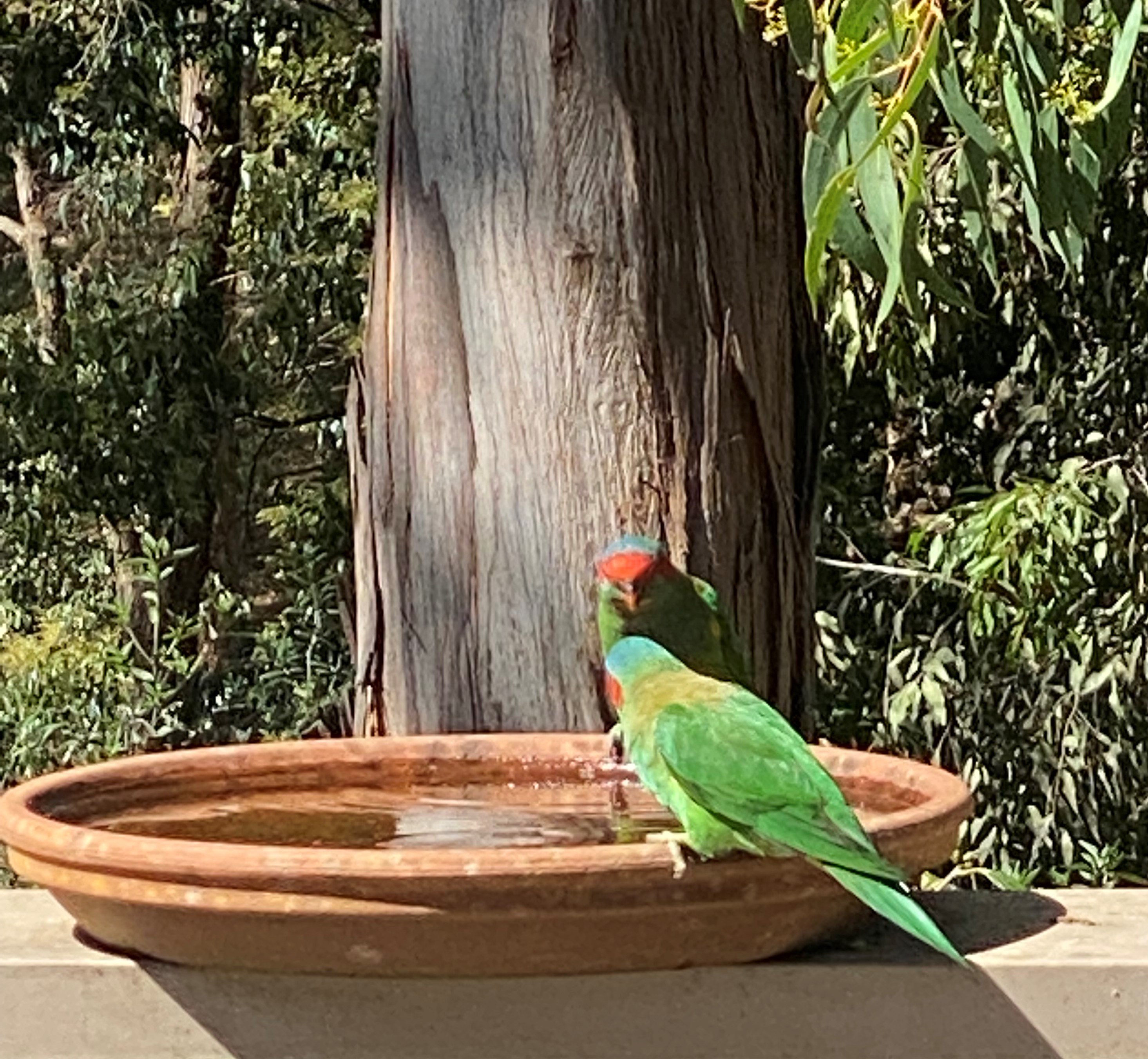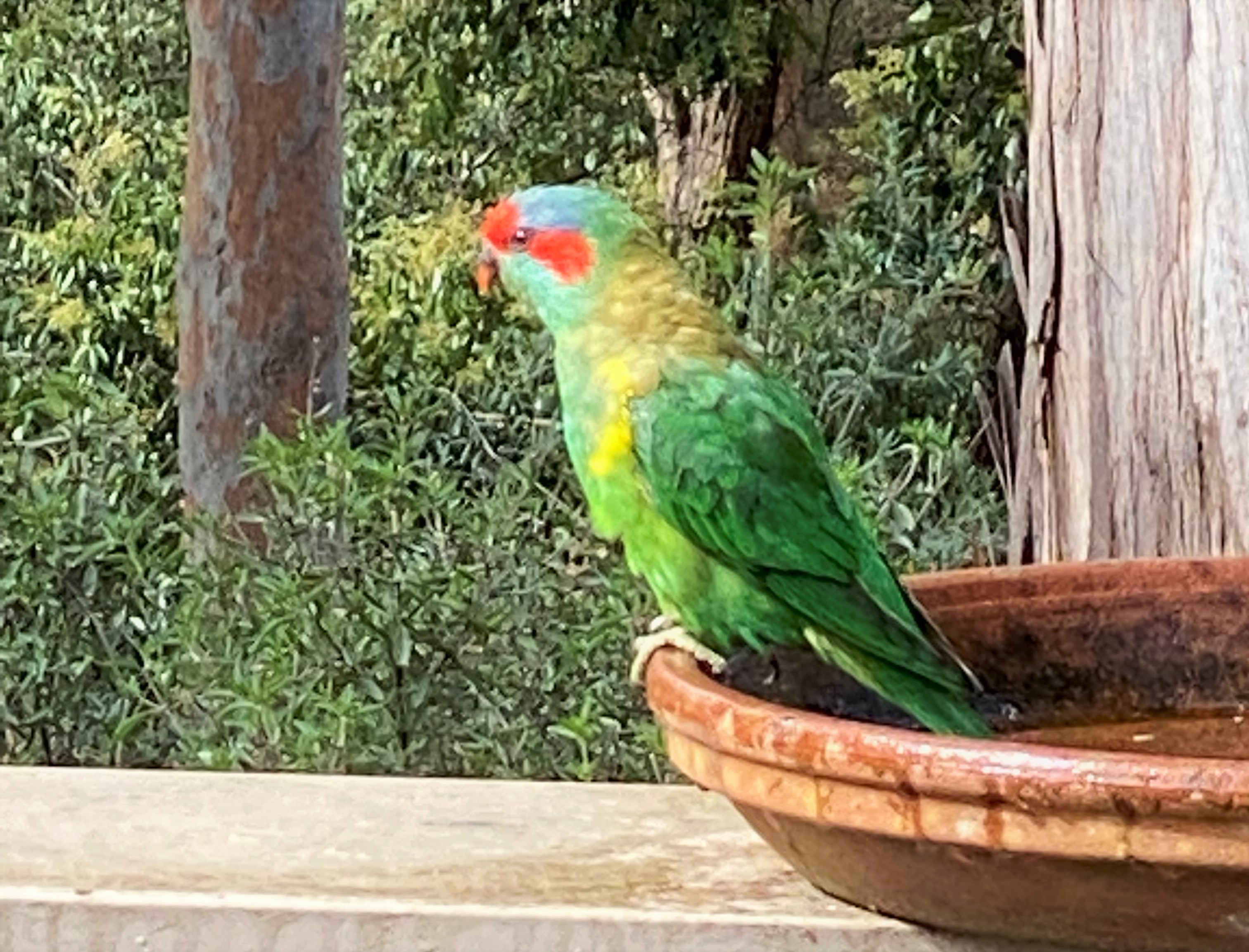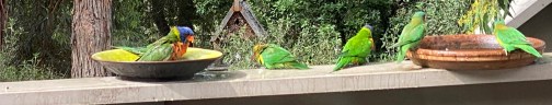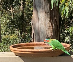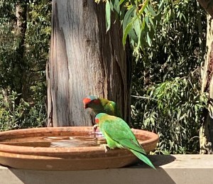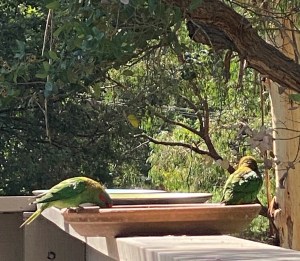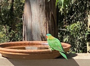 There are also newcomers to the block – the Musk Lorikeet are mainly green with yellow patches on their sides, red above their beaks and behind their eyes, and a blue crown. They really do look like they are wearing a mask.