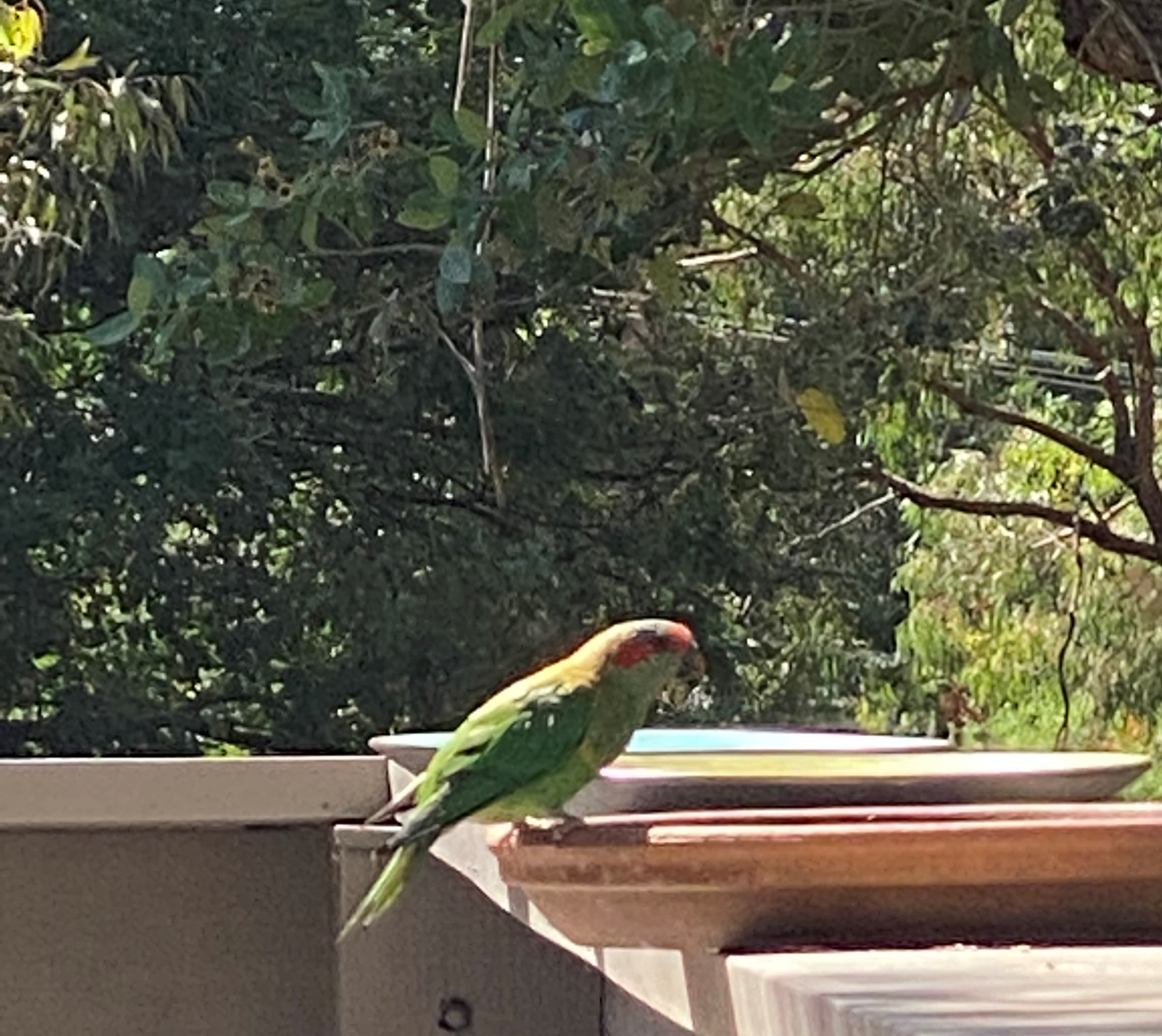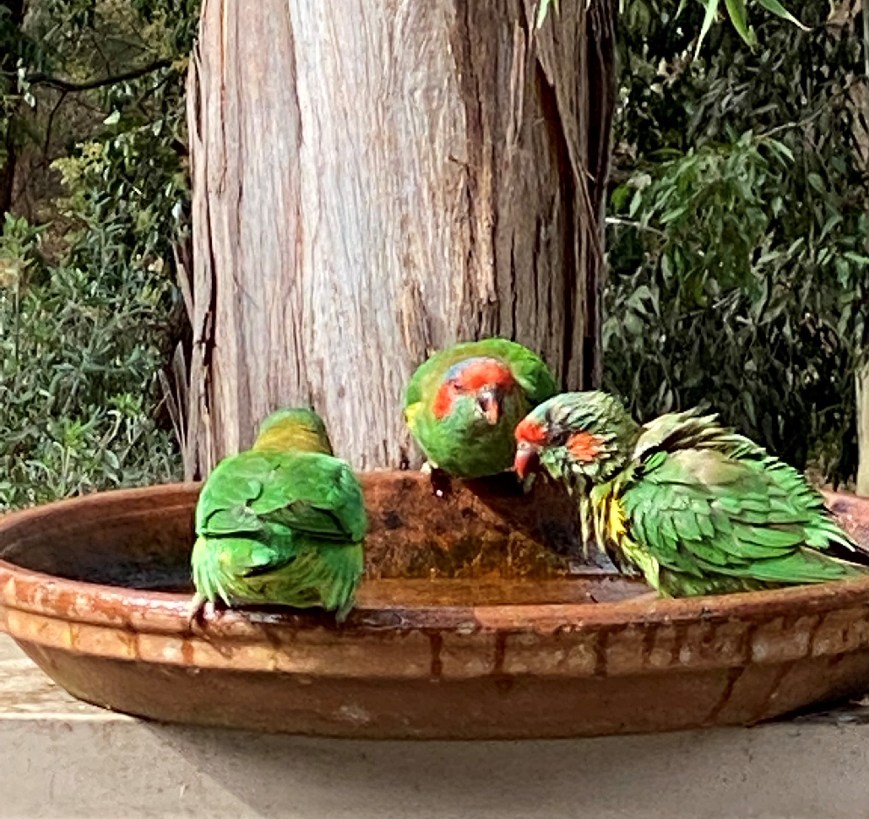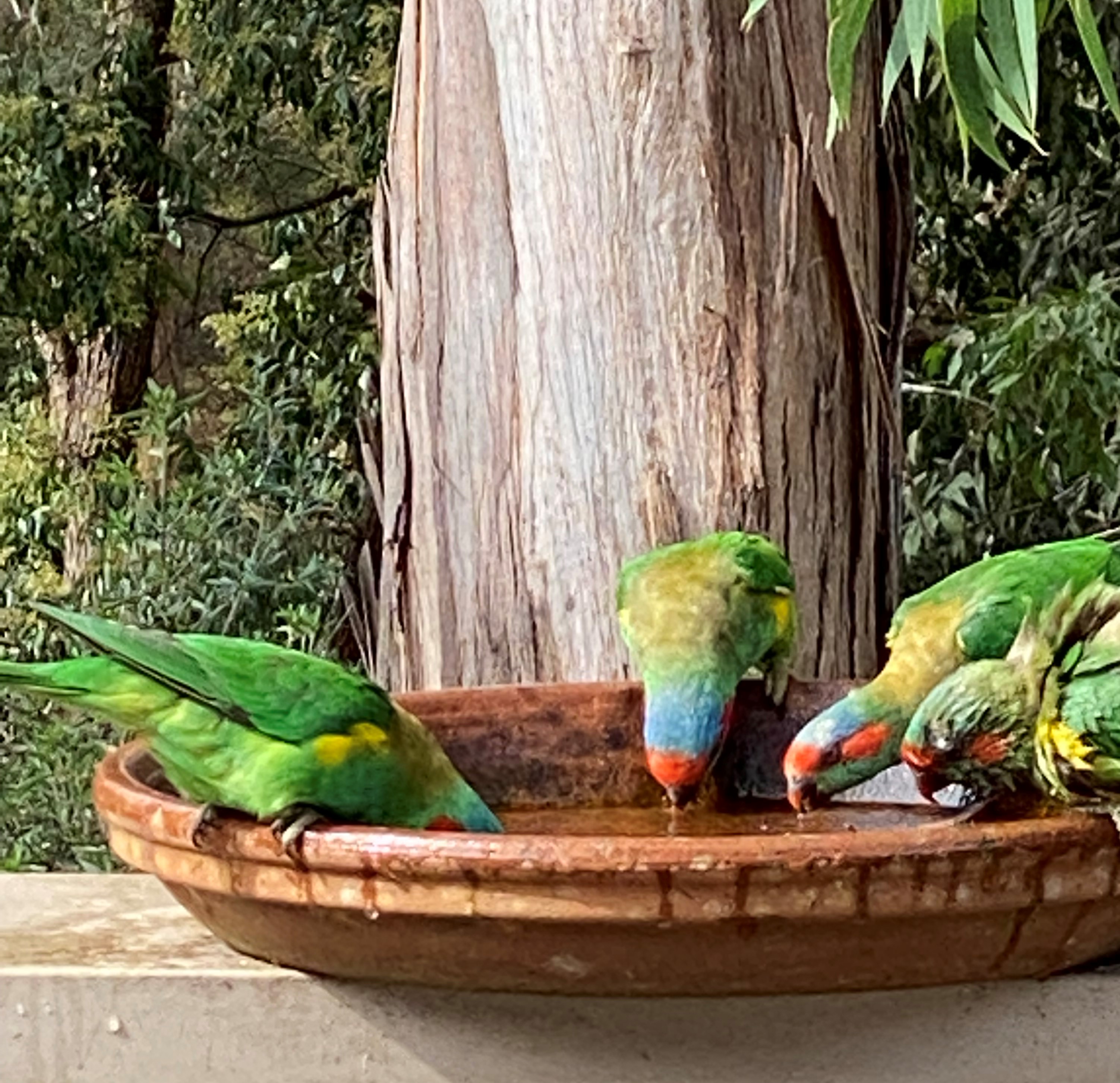 There are also newcomers to the block – the Musk Lorikeet are mainly green with yellow patches on their sides, red above their beaks and behind their eyes, and a blue crown. They really do look like they are wearing a mask.