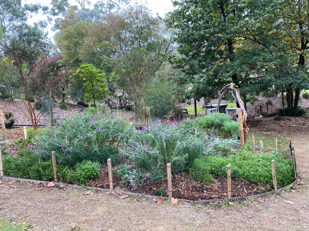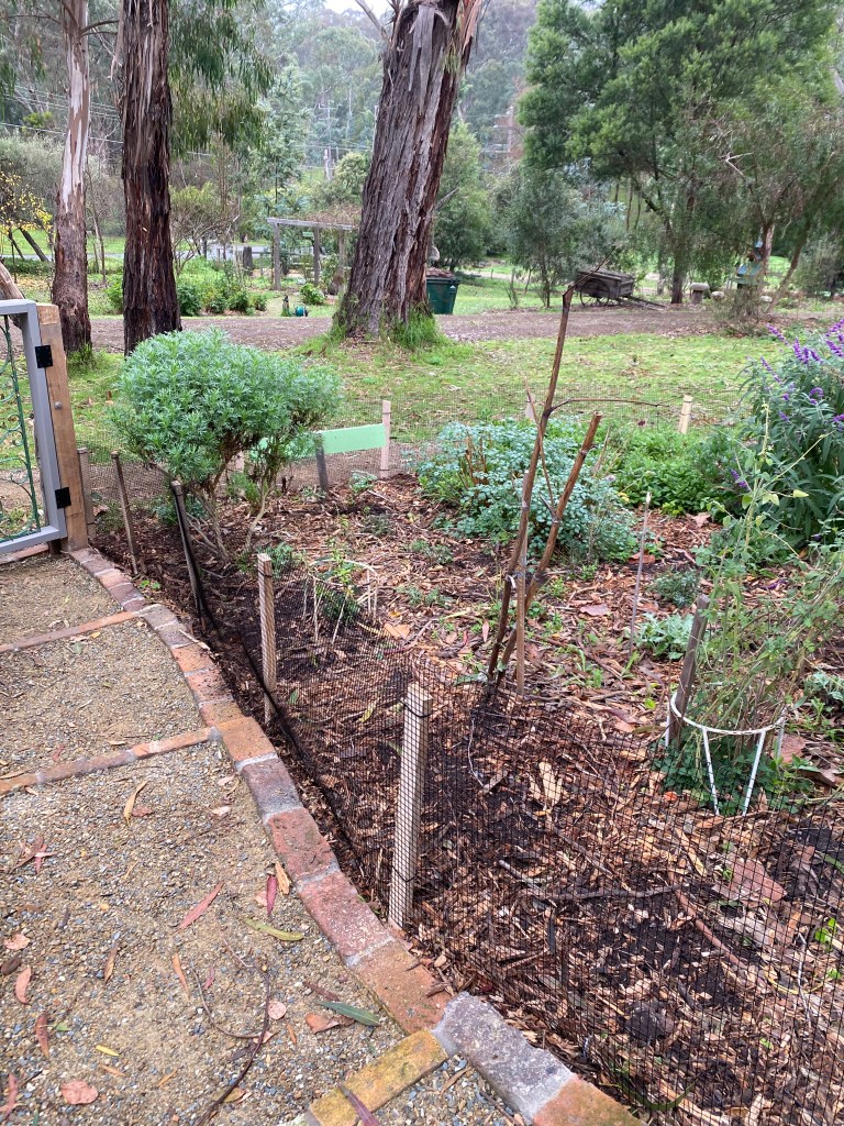 The rabbits have invaded Uccello Lane – they are everywhere and seem attracted to any new plants especially ground covers. Yes we put up “plastic” guards, made wire cyliders but in the Perennial garden we wanted to do mass planting so another idea was needsed. We good some black mesh wire that effectively becomes invisable, some tomato (and bigger) wooden stakes plus cable ties and fenced it in about an hour – it has been very successful! The kookaburras also use the gate as an observation point ready for any worm or gecko to peep out. The perennial is blooming and no rabbit digging to be see. After this we did the Secret Garden – same outcome!