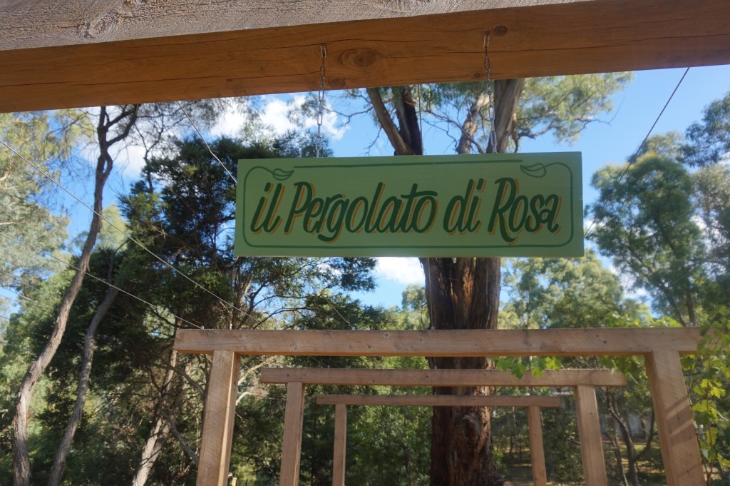 Il Pergolato di Rosa has emerged from its life as a cricket pitch to a Rose Pergola that looks like it was meant to be. Of all the garden beds we made the roses took the longest to get right – but we are there now! We covered the cricket pitch with crazy tiles – then built the pergola – a simple design but with a solid feel. Also the options of what to do with all that concrete were limited