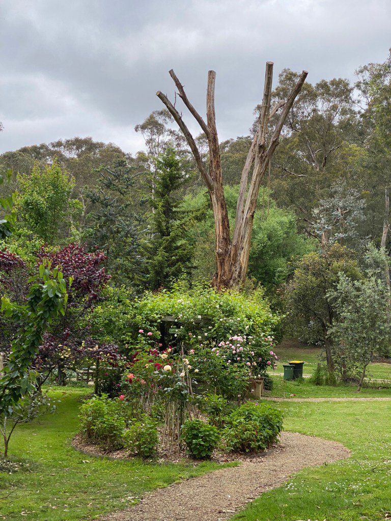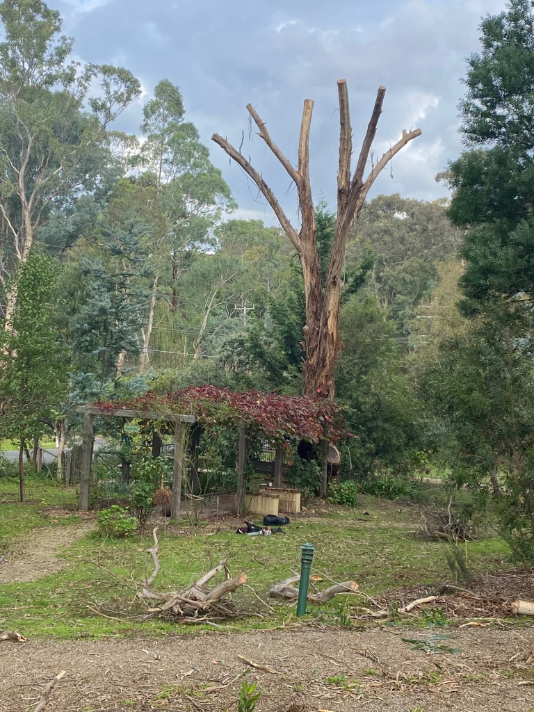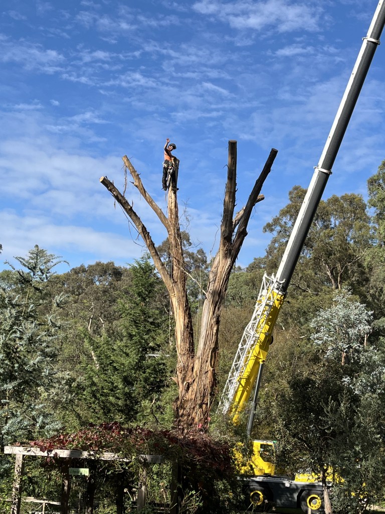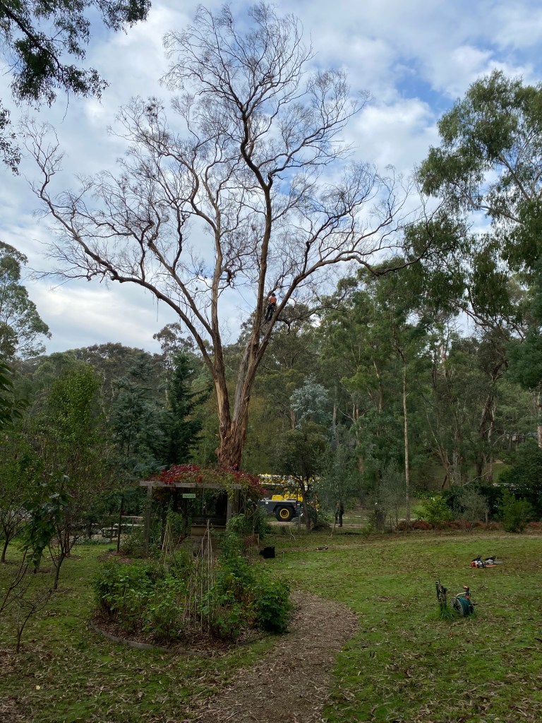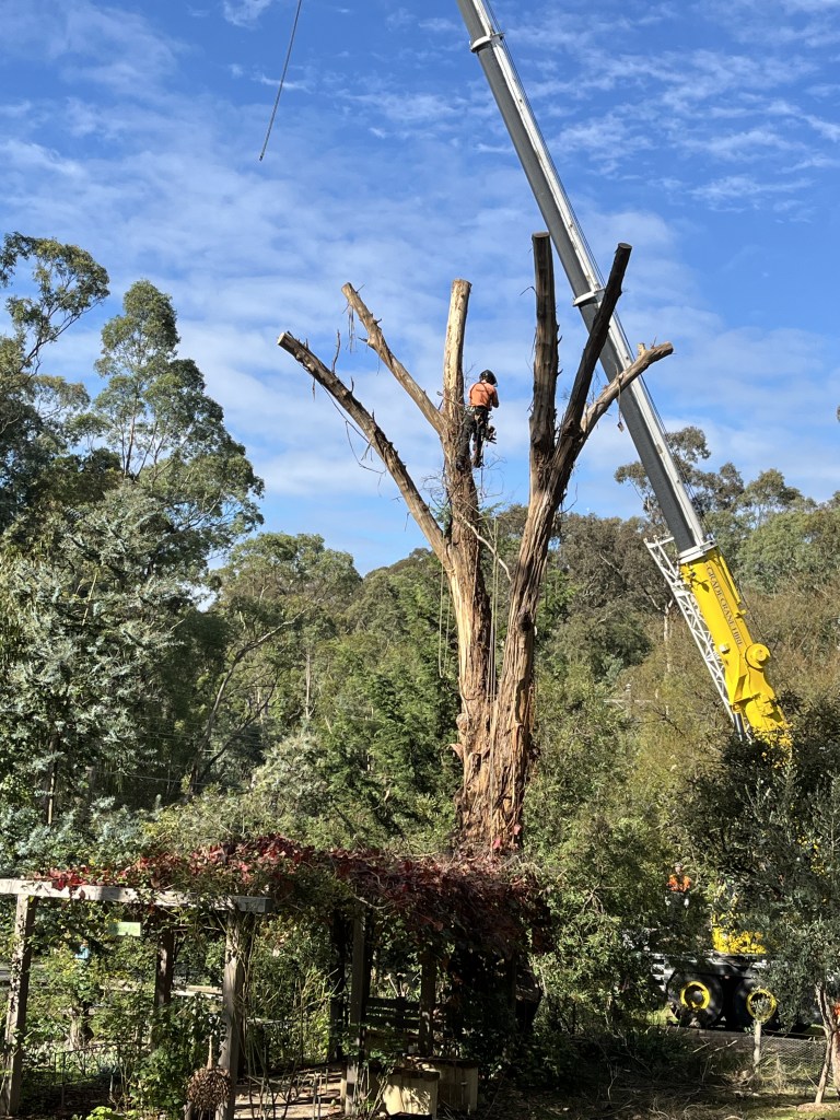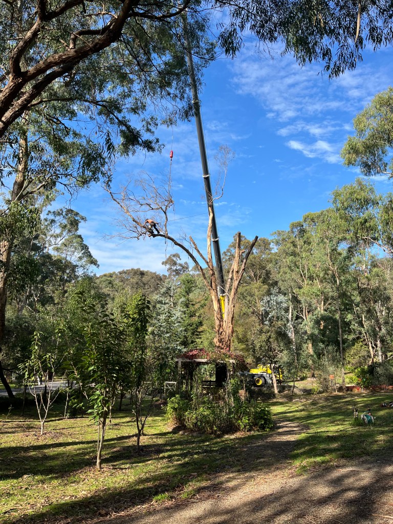 Then there was the “making safe” of the huge yellow box which had slowly died and formed the end of the “La Pegola”. This involved cranes and many high up guys from Trav’s Trees – it was nerve wracking to say the least. It is now a “native habitat” and birds (mainly ducks and king parrots) sit there and use it as a look out.