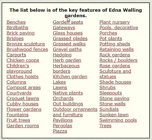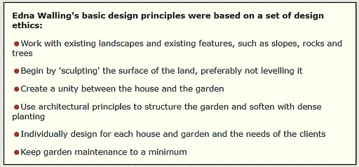 Her aim was for the garden and house relate harmoniously to each other and to the natural environment. Stone walls, uneven rough-hewn steps, a copse of silver birches, wide pergolas and paths – always softened with a mantle of greenery formed an integral part of her designs. Often a subtle blend of native and exotic trees were planted, drawing inspiration from the Australian bush, creating a more naturalistic style with boulders, rocky outcrops and indigenous plants. Edna created garden ‘rooms’ with crazy paving stones meandering from one area to another – these were “Walling” trademarks in garden design from the 1930s on.