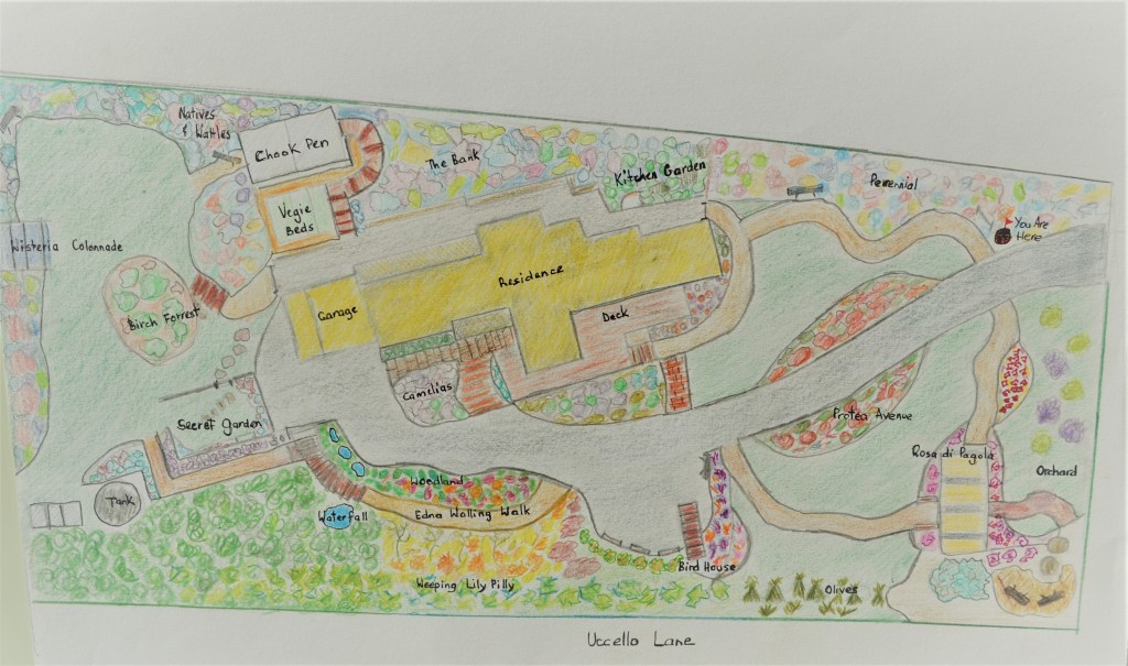 So when we began to design the Uccello Lane garden we always had inspiration and would ask – “What would Edna do?” We knew it was to have a garden we could enjoy through all seasons every day we were there! After 7 years I drew the sketch above – we were almost there.