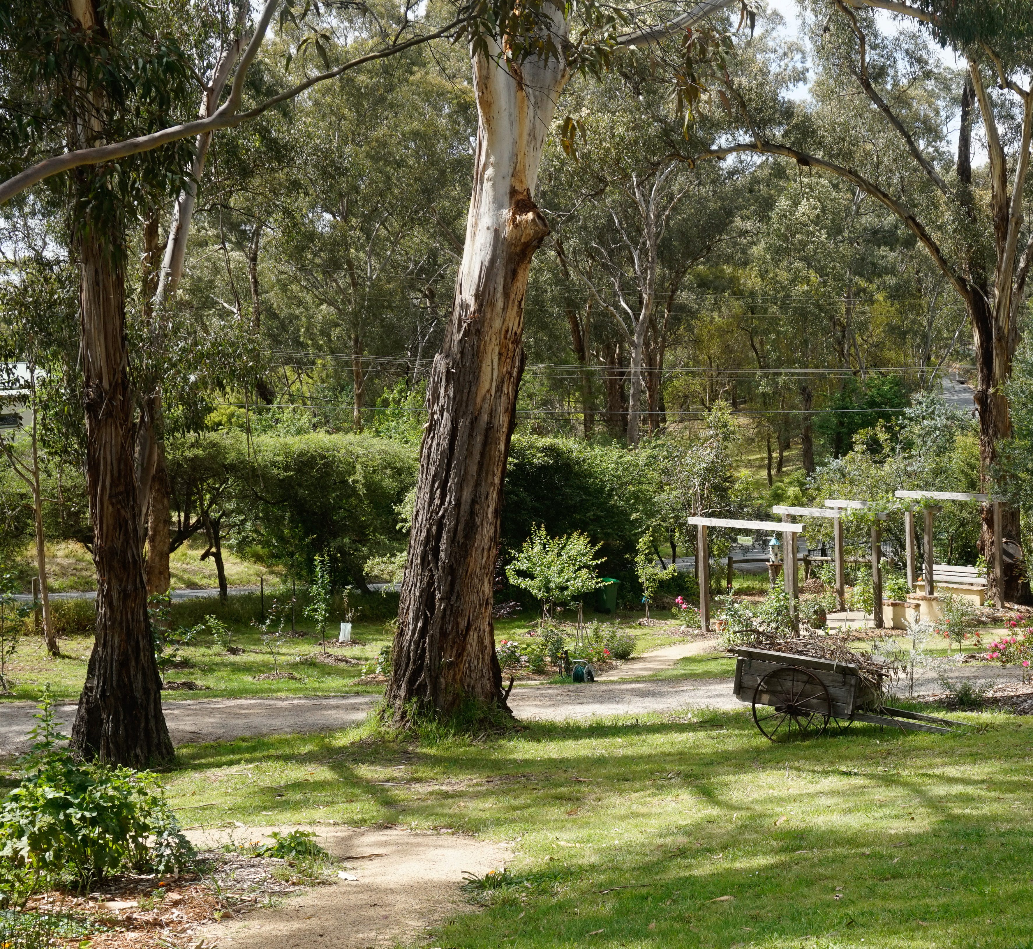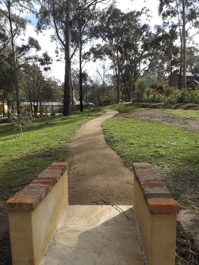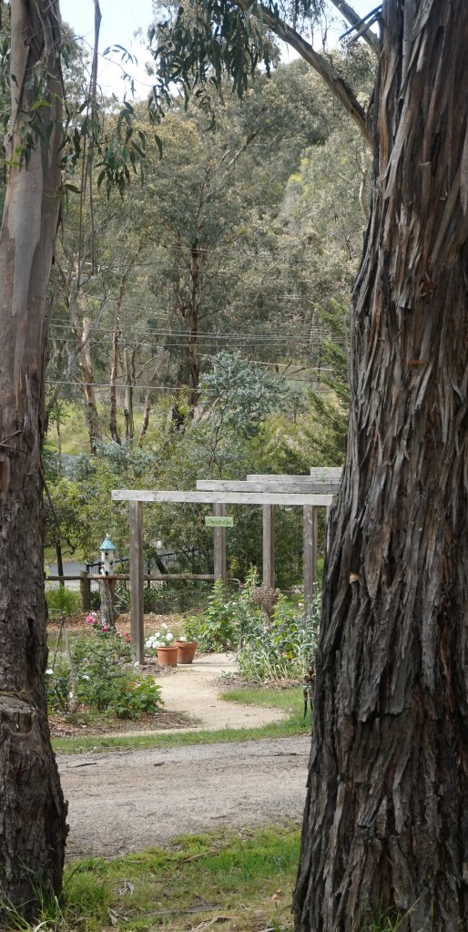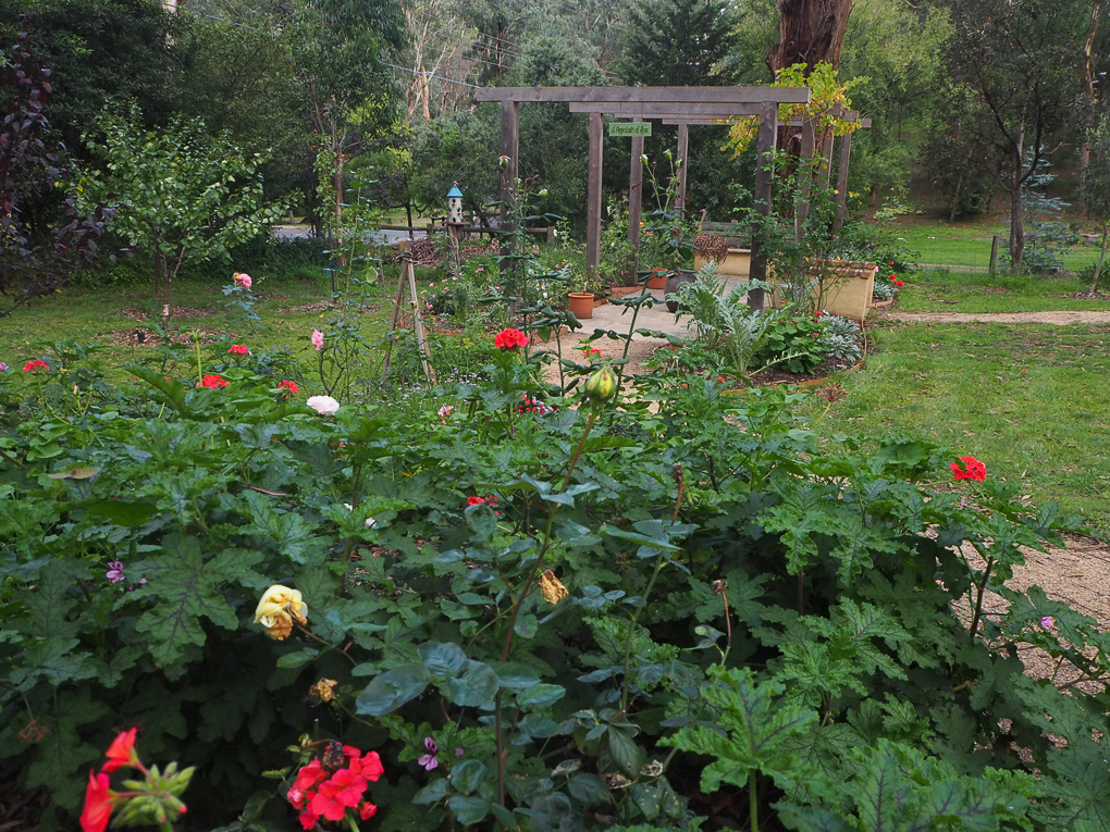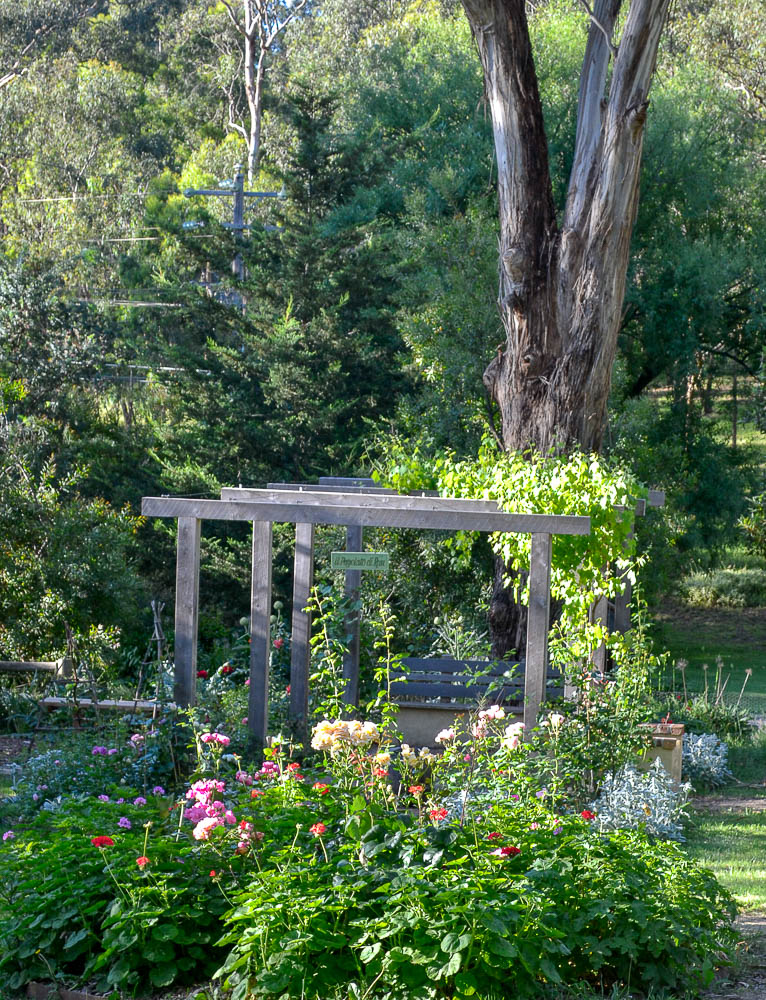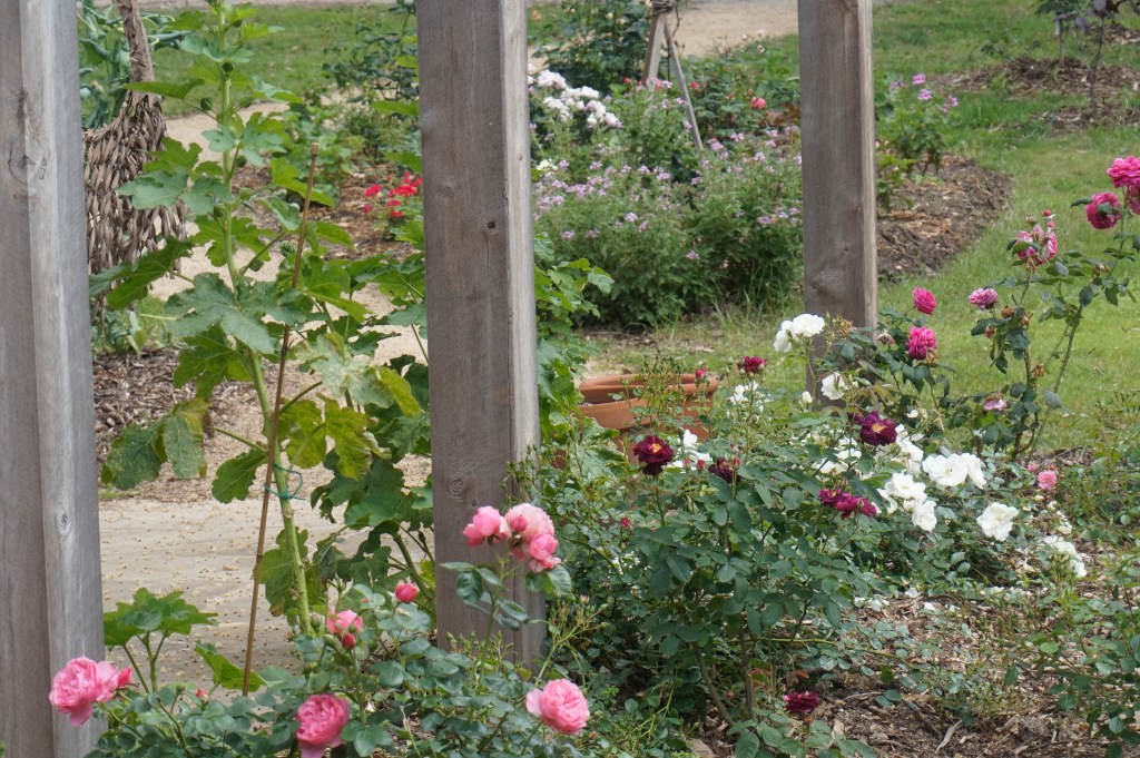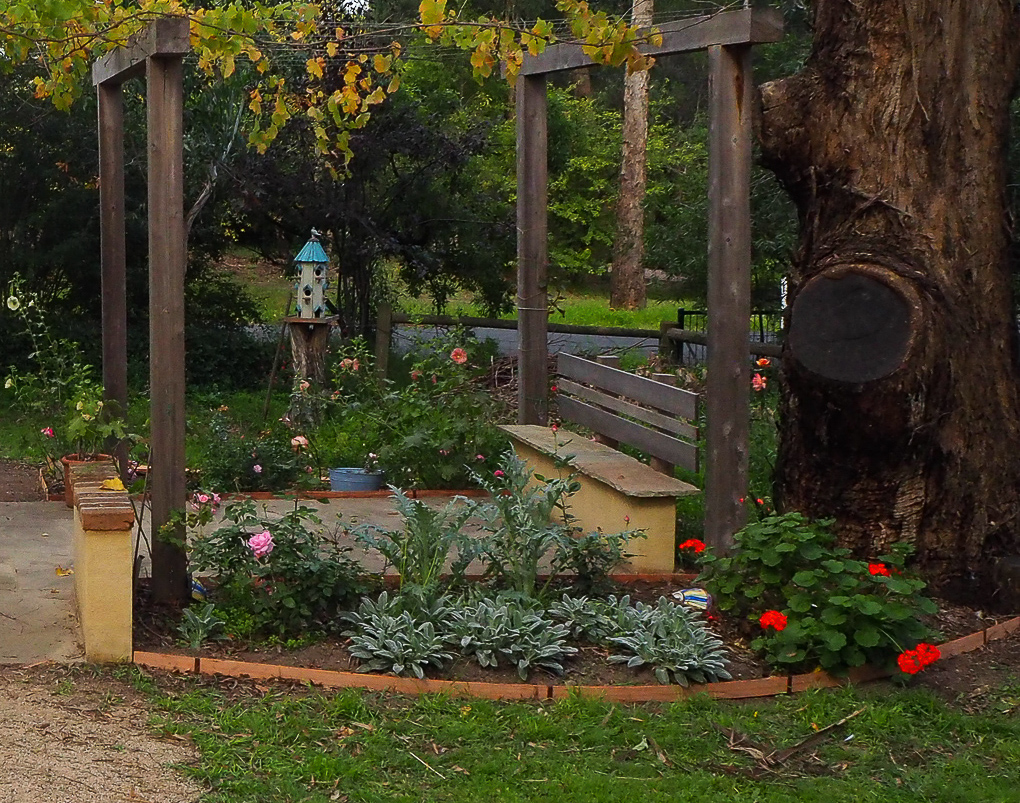 Now – There is a meandering path down that leads past welcome bed and the olive trees to the many roses. We have added some more Mary Lou Pittard tiles – some seating, another bird house, an old gate, artichokes AND some more roses. To the front there is a diamond shaped bed with geraniums lining the edge with roses in the centre.